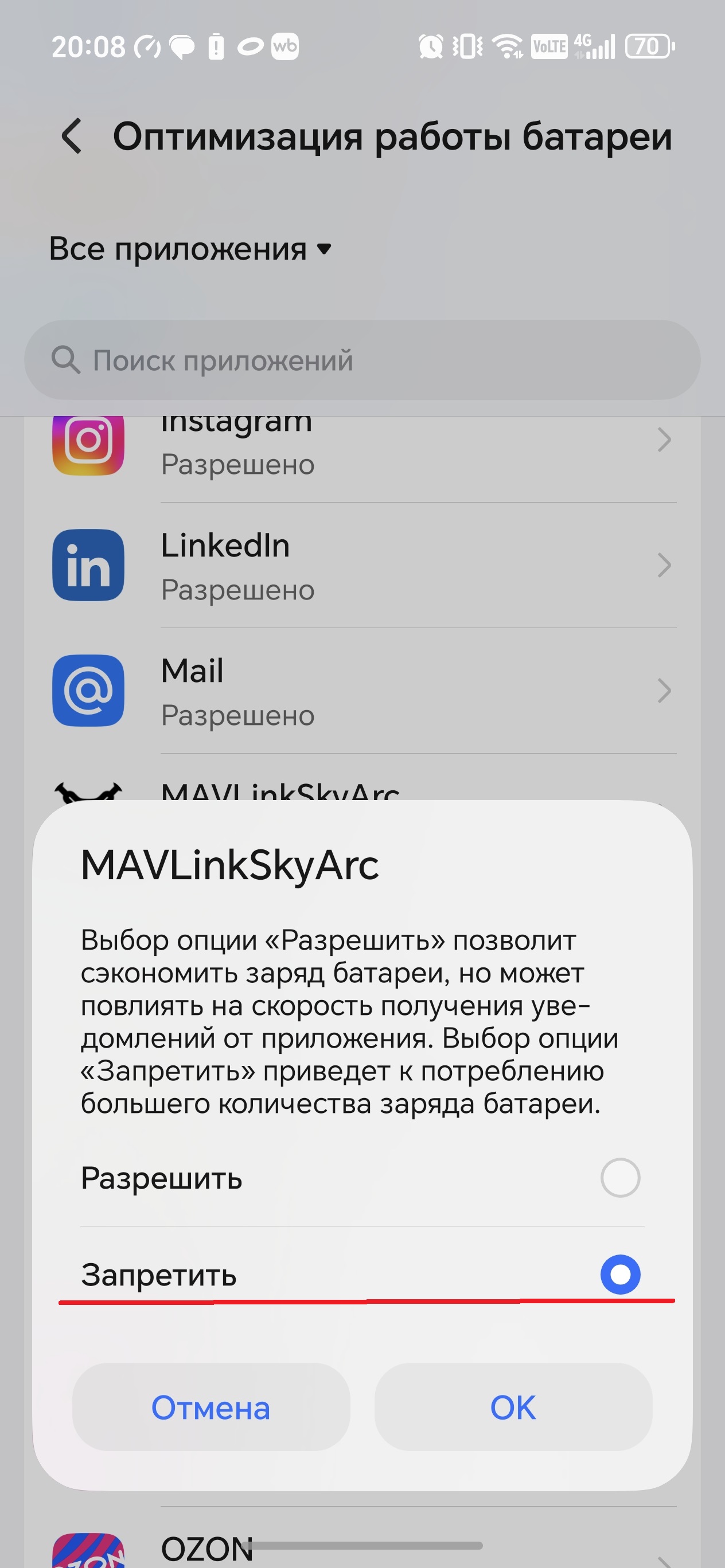 Запрет оптимизации батареи, шаг 2